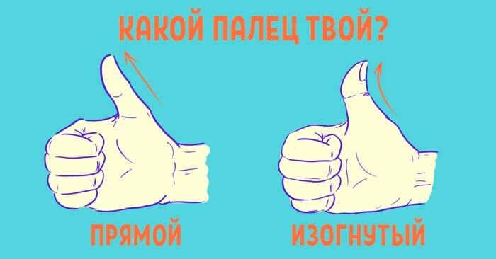 Поднимите большой палец правой руки вверх и посмотрите, куда направлен кончик пальца. Проверьте, наклоняется ли он в направлении назад, или, скорее, прямолинейный и жесткий. Если большой палец согнут назад. Вы человек, который легко и быстро адаптируется к изменениям. Вы не видите большой проблемы в этом, это довольно естественно для вас. Вы гибки в плане поведения и отношения - это помогает вам достичь своих целей и переживать трудное время.