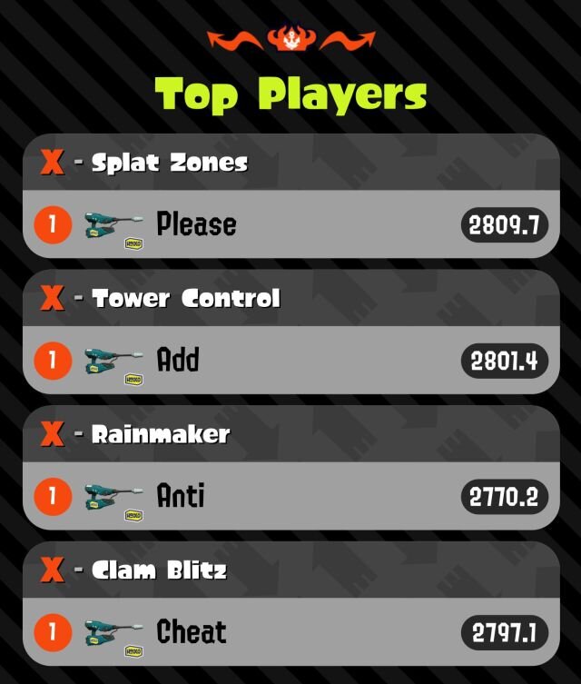 Пользователь Reddit под ником PleaseAddAntiCheat отметил, что красочный сетевой боевик Splatoon 2 «наводнён читерами, которые вносят в проект изменения и получают нечестное преимущество над остальными игроками». С целью привлечь внимание Nintendo к проблеме пользователь, используя несколько аккаунтов, внёс изменения в показатель X Power, чтобы занять высокие места в таблице лидеров. Используя эту возможность, он опубликовал сообщение: «Пожалуйста, добавьте систему по борьбе с читерами». Пользователи Splatoon 2 регулярно замечают читеров, а доказательства их существования появляются в социальных сетях. Ещё игроки не в восторге от неудобной системы, которая позволяет пользователям сообщить о читерах. Вскоре Nintendo сбросила показатели X Power у пользователя PleaseAddAntiCheat. Более того, PleaseAddAntiCheat уверяет, что больше не может играть в онлайне в Splatoon 2. «В вашем случае имело место серьёзное нарушение правил или систематические нарушения правил, поэтому использование вашего