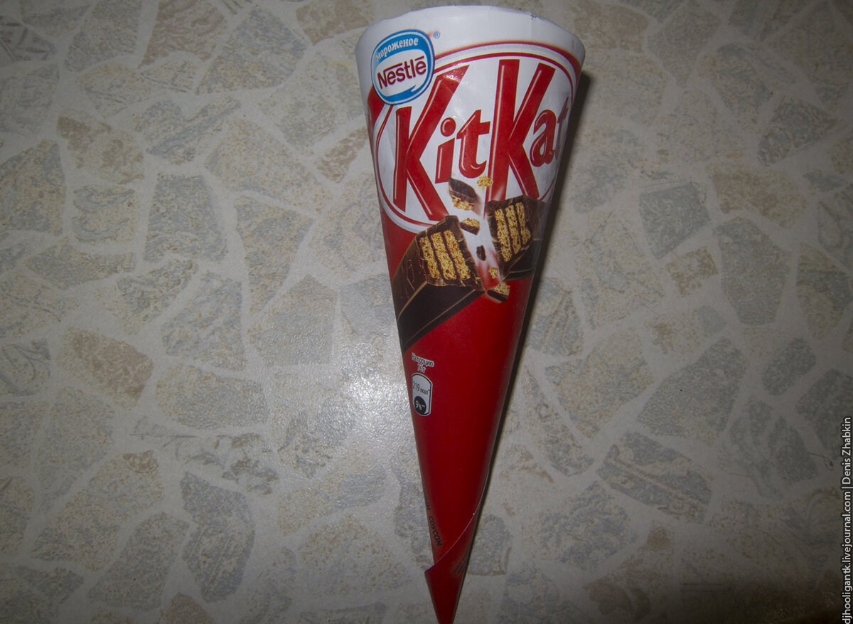 Начнём с того, что в отличие от шоколадных вафель Kit Kat, тут нет настоящего шоколада. Да чего уж там, это мороженое не из молока. В составе: масло кокосовое, пальмовое, рапсовое, шоколадный соус (без шоколада), глазурь (не шоколадная), мороженое с заменителем молочного жира из пальмового и кокосового масла. В общем позор какой-то. А уж цене своей, дороже 50 рублей за рожок, продукт совсем не отвечает.