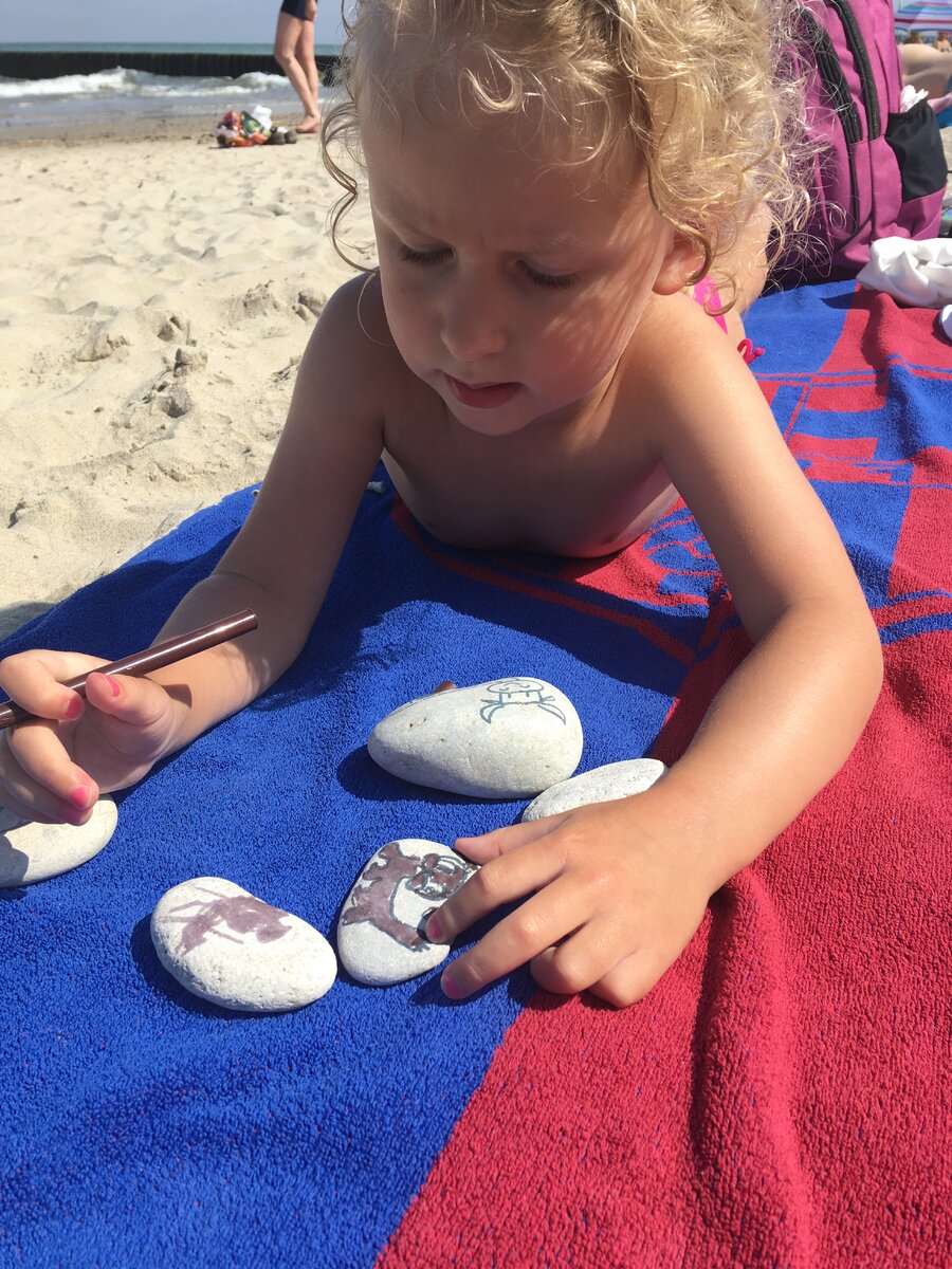 Наверное, многие мамы, имеющие маленьких и не очень маленьких деток, давно забыли, как это, просто посидеть и позагорать, глядя на море. И все потому, что во все глаза смотрят за бегающим туда сюда чадом. Конечно, есть такие дети, которые самозабвенно лепят куличи рядом с мамой и никуда особо не перемещаются. Но, это точно не про нас. Полина может довольно надолго чем-то увлечься, но занятие должно быть интересное. И вот мы решили, что будем рисовать и раскрашивать...на камнях. Взяли фломастеры и вот, что у нас получилось. Конечно же, рисовала сначала я, а Полина с удовольствием смотрела, кто покажется на камушке, а потом раскрашивала. Позже ей захотелось попробовать самой изобразить что-то похожее. И на камушках стали появляться зверюшки, похожие на тех, которых рисовала я. Я была удивлена, насколько похоже она повторяет за мной. Это были не просто кружочки и произвольные фигурки, а самые настоящие собачки и кошечки, нарисованные детской ручкой. А однажды Поля взяла и нарисовала