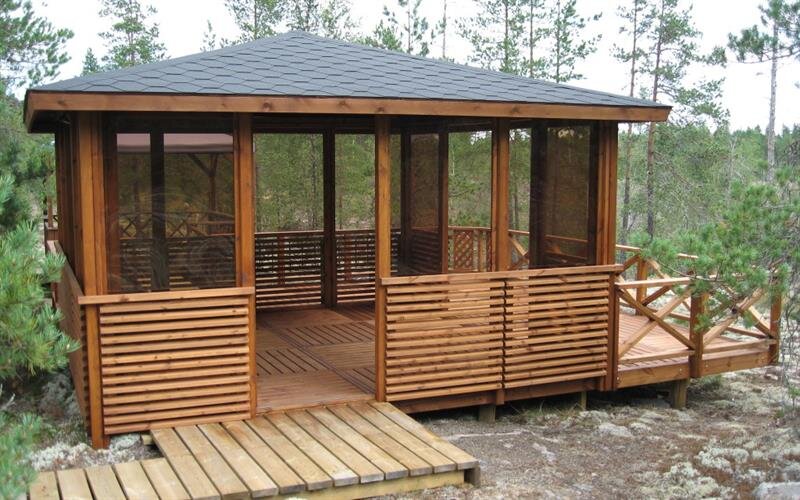 Балки крыши изготавливают из того же бруса, что и стойки. В их длине учитывают размер свесов крыши. Прочными металлическими нержавеющими уголками балки надежно соединяют со стойками. Угловую стойку устанавливают первой, а от нее ведут разметку по натянутому шнуру и заданному углу. Равный шаг между стойками, их вертикаль и единый уровень выдерживают с особой тщательностью! Закрепление ограждающих элементов, с подгонкой по высоте, делают нержавеющими шурупами. Решетчатый и сплошной элементы (30 и 150 см) в сборе дают стандартную высоту забора 180 см. Свес крыши должен достаточно выступать за забор. Это предотвратит попадание дождя в беседку. Стропила делают из бруска для крайних - 40 х 60 см и остальных - 40 х 40см. Их крепят поперек балок. Стропила зашивают встык обрезной доской. Затем края точно подрезают по линиям свесов. Кровлю делают из рубероида, прибивая его специальными гвоздями. По краям прибивают козырьки. Беседка со снятым боковым ограждением выгляд