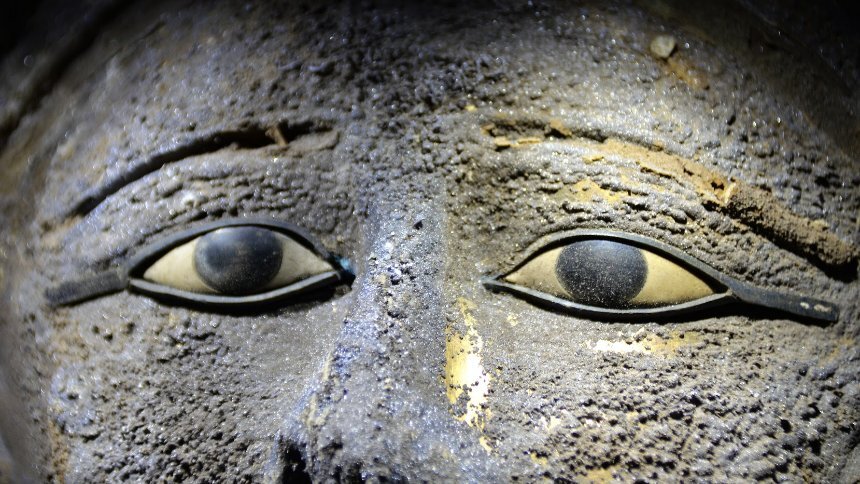 По сообщению, маска лежала на лице мумии. Исследователи обнаружили их в поврежденном деревянном гробу. Украшения на гробу означали, что эта мумия может быть священник египетских богинь мужества и Ниут-Ши. Глаза были сделаны из черного драгоценного камня, возможно оникса, и кальцита и обсидиана.