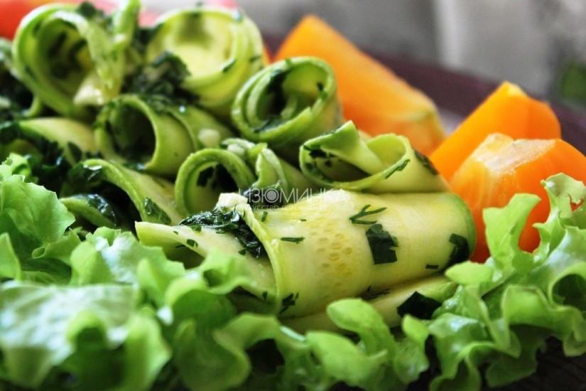 Кабачки - не самый распространенный овощ из тех, который употребляется в пищу без термической обработки. Но! Попробовав раз, хочется возвращаться к ним снова и снова: сырые кабачки прекрасны. У них легкий ореховый привкус, очень приятная хрустящая текстура, кроме того, внутри прячется масса полезного и нужного для человеческого организма. Маринованные кабачки готовятся на самом деле элементарно. Настолько легко и просто, что, можно сказать, и не готовятся вовсе - так, просто нарезаются тоненько и красиво, и больше ничего. Отдельно хочется акцентировать внимание на том, что маринованные кабачки по этому рецепту готовятся без термической обработки, а значит, овощи сохраняют тот максимум витаминов и микроэлементов, который вообще могут предложить. Как приготовить маринованные кабачки? Ингредиенты: 2-3 молодых кабачка небольшого размера; 1 большой пучок зелени (здесь кинза и укроп); 3-4 ст. л. оливкового масла; 3-4 зубчика чеснока; 3 ст. л. яблочного или любого другого фруктового уксус