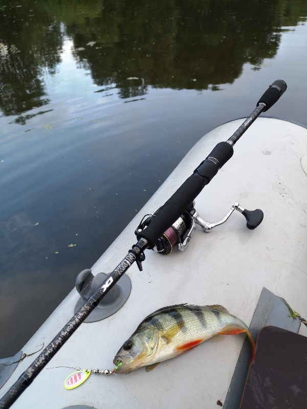 Статья на портале РНарод После жары в Москве наступила непонятная погода. Немного похолодало и солнце сменяется дождём, давление скачет, но когда у тебя на рыбалку выпадает одно утро воскресенья, то погоду не приходиться выбирать. Итак, очередное утро, дачное озеро. Пока ждал товарища, накачал лодку и собрал снасти. Из снастей у меня JS Company NIXX DX S802ML, катушечка shimano vanquish C3000 и 0.6 шнурок. А вот поймать я сегодня хотел на блесны и воблеры. Как мы и не хотели этого, но дождь все таки пошёл и нам пришлось некоторое время ловить из под деревьев. Я смеялся, говоря товарищу, мы с тобой сидим в лодке, на берегу, под деревом и ловим рыбу. А вот рыба поклевывает, но совсем мелкого размера. Вот дождь закончился, выглянуло солнышко, и мы заняли правильное положение на точке. Забросы, проводки и вот он матросик на крючке, за ним ещё один и так несколько окуньков поймано на вертушку. Воблер к сожалению молчал и я решил перейти на резину. На небольшой виброхвостик поклевывали о