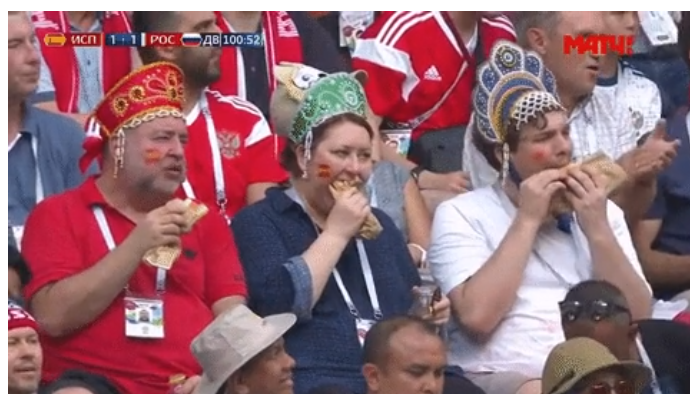 Во время трансляции матча Россия — Испания телекамера сняла двух мужчин и женщину в кокошниках, которые охотно жевали булочки . В соцсетях кадры из трансляции использовали в многочисленных мемах. И в заключение мы провожаем этот футбольный праздник, в котором наши футболисты очень достойно выступили на этом замечтельном турнире . Спасибо им за это! А ещё спасибо болельщикам за атмосферу, иностранцам — за пёстрые зрелища на улицах футбольных городов, футболу — за повод