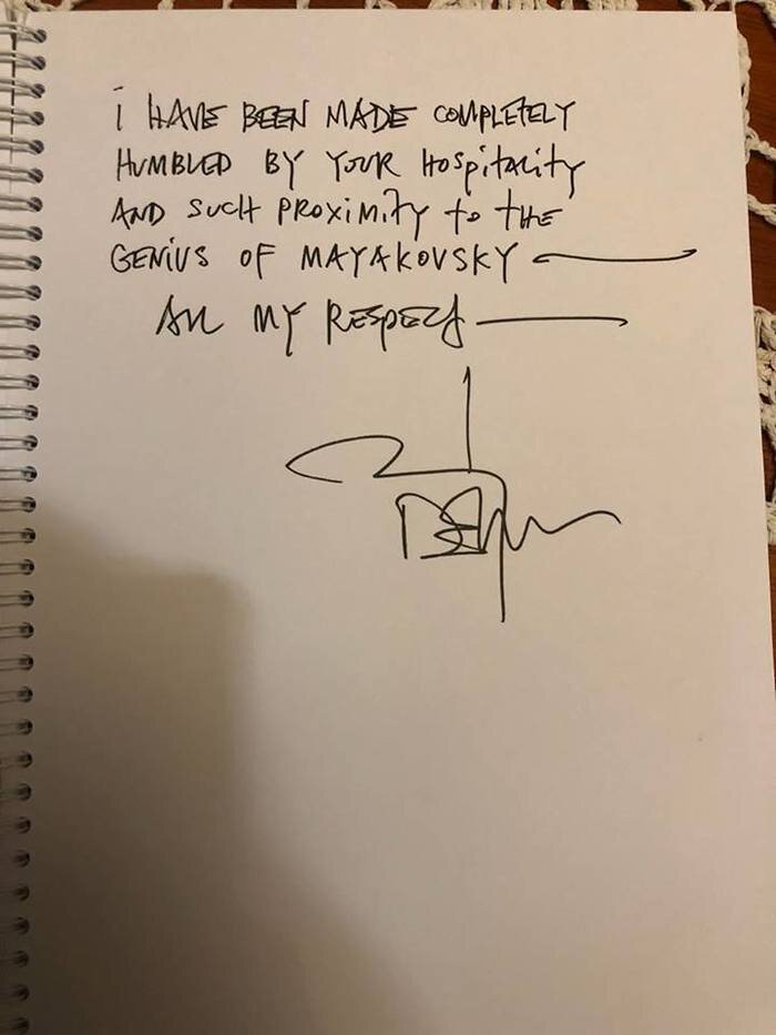 В выходные Джонни Депп Посетил Москву. У него был запланированный концерт в «Олимпийском» По прибытию актер решил поближе познакомится с русский культурой. Первое место куда он отправился был музей «В.В. Маяковского» Работники музея даже и представить не могли какой гость к ним заглянет на выходные. Актер был в восторге от музея и прекрасного персонала. Он потребовал Гостевую книгу, чтобы изложить свои впечатления. “Я был абсолютно поражён вашим гостеприимством и такой близостью к гению Маяковского. С уважением, Джонни Депп” В особенности его поразила экспозиции из архивов Патрисии Томпсон. Актер был удивлён точности музея и атмосферой США 20-х Узнав, что директор лично договаривался об получении этих архивов, поспешил сделать ещё одну запись. Но уже личную благодарность. “Алексей – Моя искренняя благодарность за то, что вы позволили мне взглянуть на жизнь одного из моих кумиров, великого Маяковского. С огромным уважением, Джонни Депп” Джонни Депп хотел лично встретится с Алексеем Л