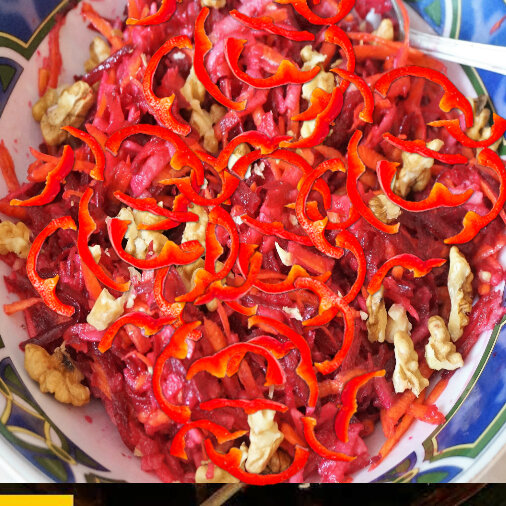 Морковь и яблоко способствуют омоложению кожи тела, сырая свекла хороший антиоксидант, обеспечивающий профилактику новообразований, болгарский перец богатый витаминами и микроэлементами избавит от авитаминоза, укрепляя кровеносные сосуды, нервную систему и очищая кровь от холестерина. Составляющие яблочно - овощного салата. = 1 свежее яблоко, = 1 свежий перец (болгарский), = 1 сырая свекла, = 2 свежие морковины (не больших), = 1 ч. л. ложка лимонного сока, = 4 веточки зелени (петрушки) = 250 гр. йогурта = соль по вкусу Верх салата возможно украсить (при желании), покрошив несколько грецких орешков. Порезать полу - кружочками болгарский перец с петрушкой, через тёрку с крупными отверстиями истереть овощи и яблоко, слегка освежить соком лимона и сдобрить йогуртом. Добавить орешки (при желании). Приятного аппетита!