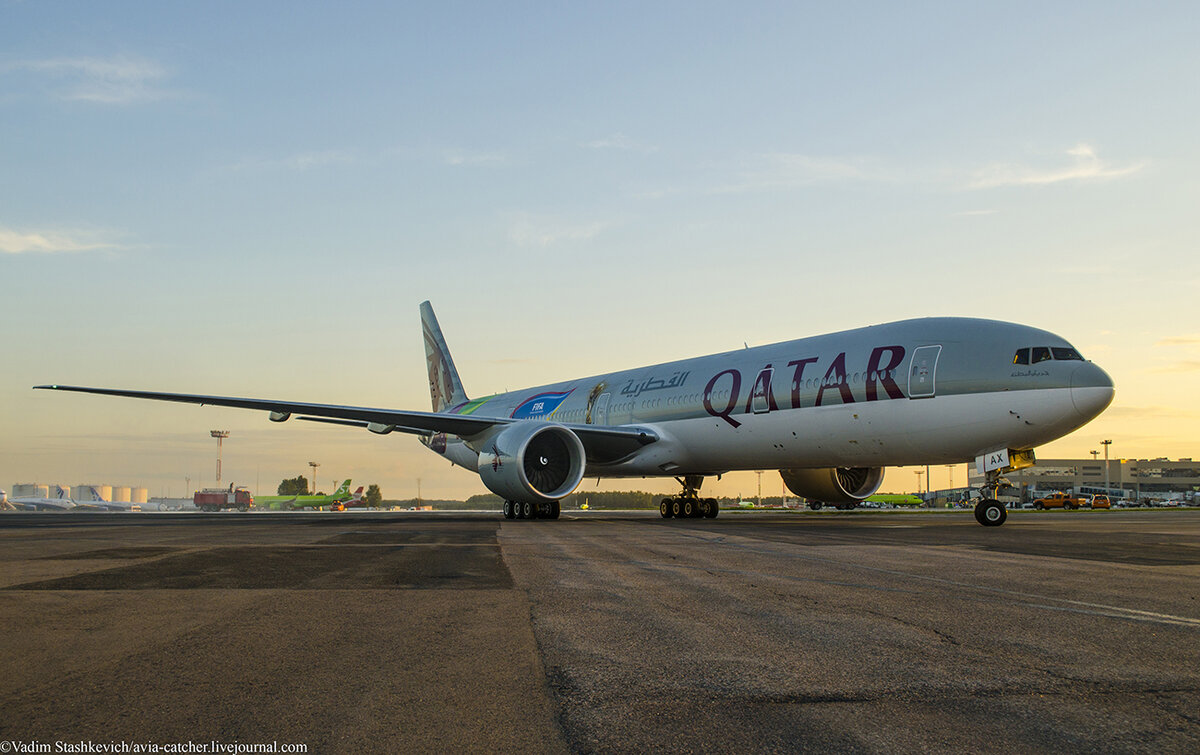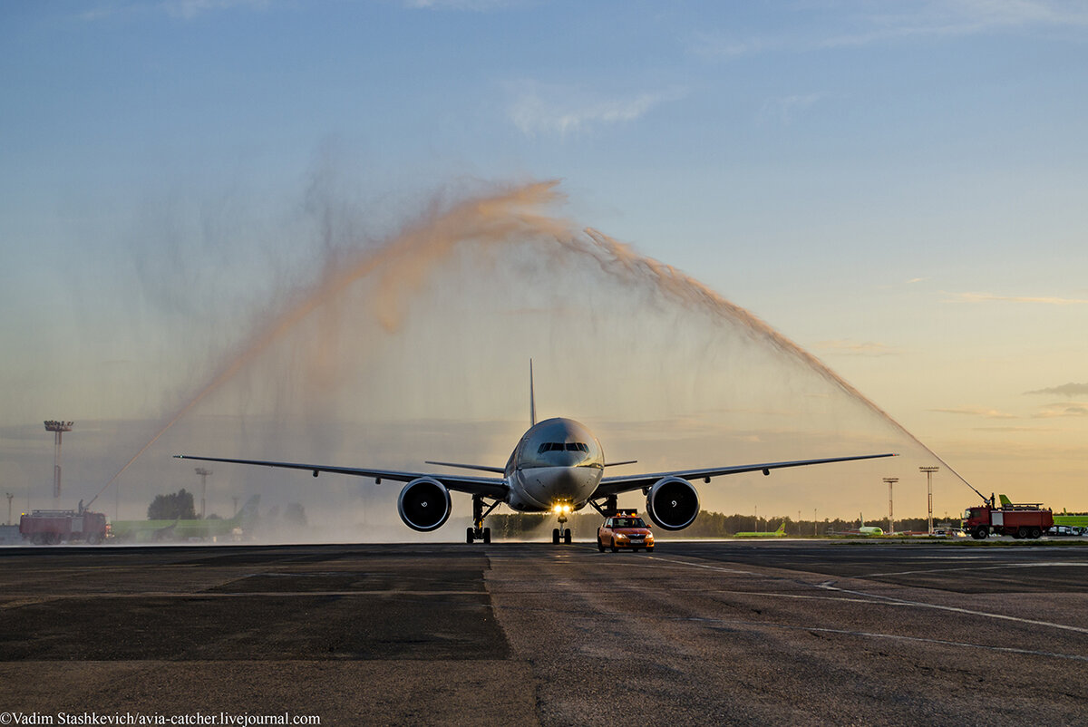 Кажется сейчас как раз самое время, для того чтобы хорошенько пропиарить предстоящий чемпионат мира, в Москве много туристов, а значит хороший охват аудитории. Катарцы об этом тоже знают, поэтому именно на этой неделе к нам прилетает ново окрашенный борт Qatar airways в промо ливреи Fifa Word Cup 2022! Встречали как обычно с размахом, с водяной аркой шириной в размах крыльев Boeing 777! Кстати впервые вижу арку в ДМЕ, расположение крайне удачное, можно сделать массу отличных кадров!