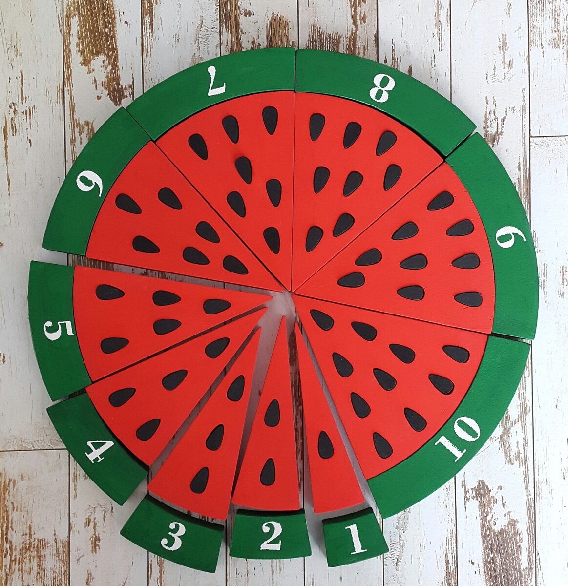 Счет нужен всем! А как научить кроху считать, например, банки бабушкиного варенья, или сколько ступенек нужно пройти до квартиры, да и чтобы ориентироваться во времени в будущем. Без счета вообще никак не обойтись! И тут у каждой мамы встает вопрос: как же научить легко и просто кроху считать ?! На самом деле, сейчас много литературы на эту тему, но я хочу поделиться собственным опытом, как мы с моим малышом 2-3х лет овладели счетом до 10-ти в игровой форме. На просторах Интернета я нашла очень интересную игру под названием пазл "Арбуз". Это простая игра - пазл, которая поможет малышу освоить цифры, освоить первый счет, а также еще больше развить мелкую моторику. Эта игра-находка для нас, ведь ребенок в период 2-3х лет неусидчив, и чем-то завлечь его надолго не так-то просто. Я считаю, что игра-пазл "Арбуз" интересна и познавательна, а вот почему: Во-первых, она яркая - в форме спелого сочного арбуза, что привлекает внимание малыша. Во-вторых, детки любят перебирать всякую мелочь,