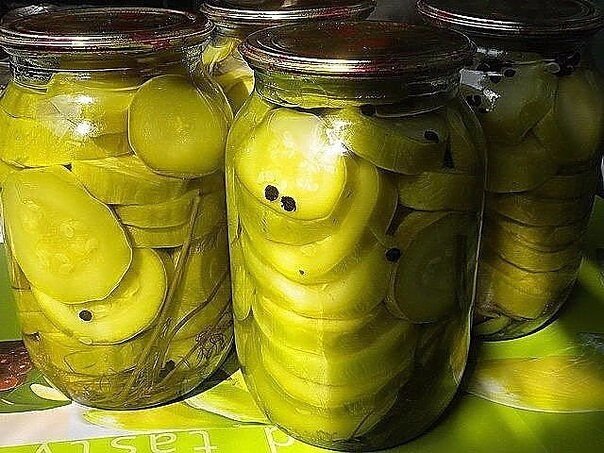 Кабачки на зиму! Всё очень просто! На 0,5 л банку - укроп, перец горошком по вкусу. 3 - 4 зубчика чеснока. 2 чайные ложки соли 2 столовые ложки уксуса Залить кипятком и стерилизовать 10 минут!