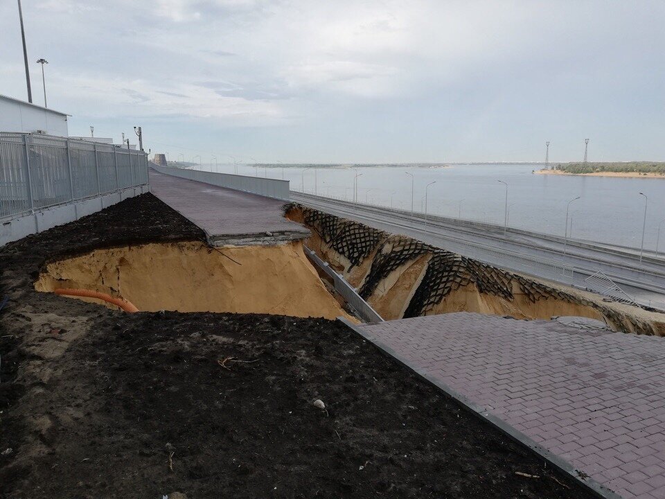 В воскресенье, 15 июля,в Волгограде прошел проливной дождь, из-за которого смыло часть дороги около арены.В провал, по приблизительным оценкам, может поместиться двухэтажный дом. Водой и грязью залита новая набережная.