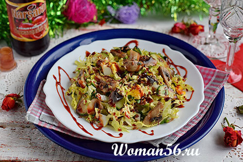 Помимо грибов, в состав салата входит пекинская капуста, огурец и яйца. Для большей нарядности поливают салат гранатовым соусом и присыпают зернами льна.