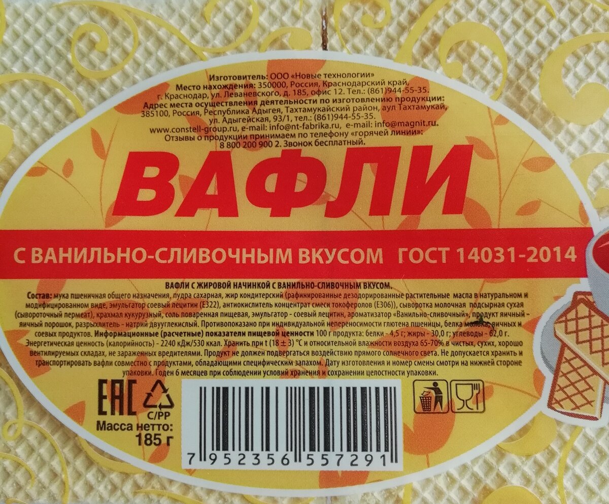 Сегодня мне захотелось сладенького. Увидела вафельки всего за 22.40 руб, изготовлены ООО "Новые технологии", попробуем на вкус. Согласно Википедии: Вафля (от нем. Waffel) — разновидность тонкого сухого печенья с оттиском на поверхности. Выпекается из взбитого жидкого теста в специальных формах. Тесто состоит из муки, яиц, сахара и сливок. Начнем с состава. Тут все очень печально, сплошная химия, растительные жиры и Е-шки. Вес упаковки 185 грамм, внутри 12 штук вафелек. Сами вафли очень тоненькие всего два слоя с прослойкой. Вафли ровные не поломанные. При открывании в нос резко бьет очень сильный аромат ванили, по видимому ароматизаторов производитель не пожалел. На вкус сами вафельные коржи нерезиновые, хрустящие, но какие то пресные, безвкусные.Зато начинка на мой взгляд ну очень приторная, сладкая и к тому же сильно чувствуется вкус растительных жиров. Вывод: покупкой я осталось не очень довольна, скорее всего больше такие вафли не буду покупать. Уж очень сильно чувствуются аром