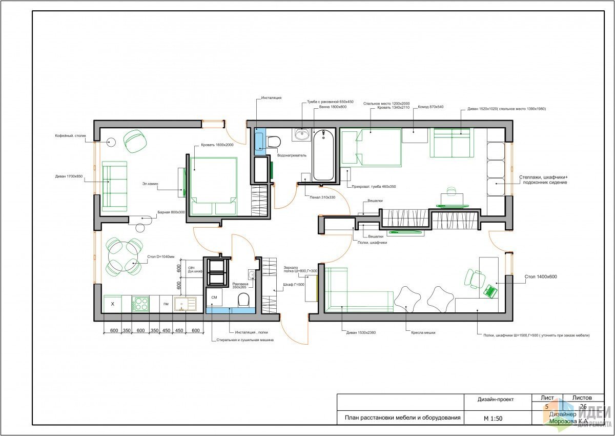Яркий дизайн квартиры 85 кв. м с тремя спальнями и кухней-гостинной.