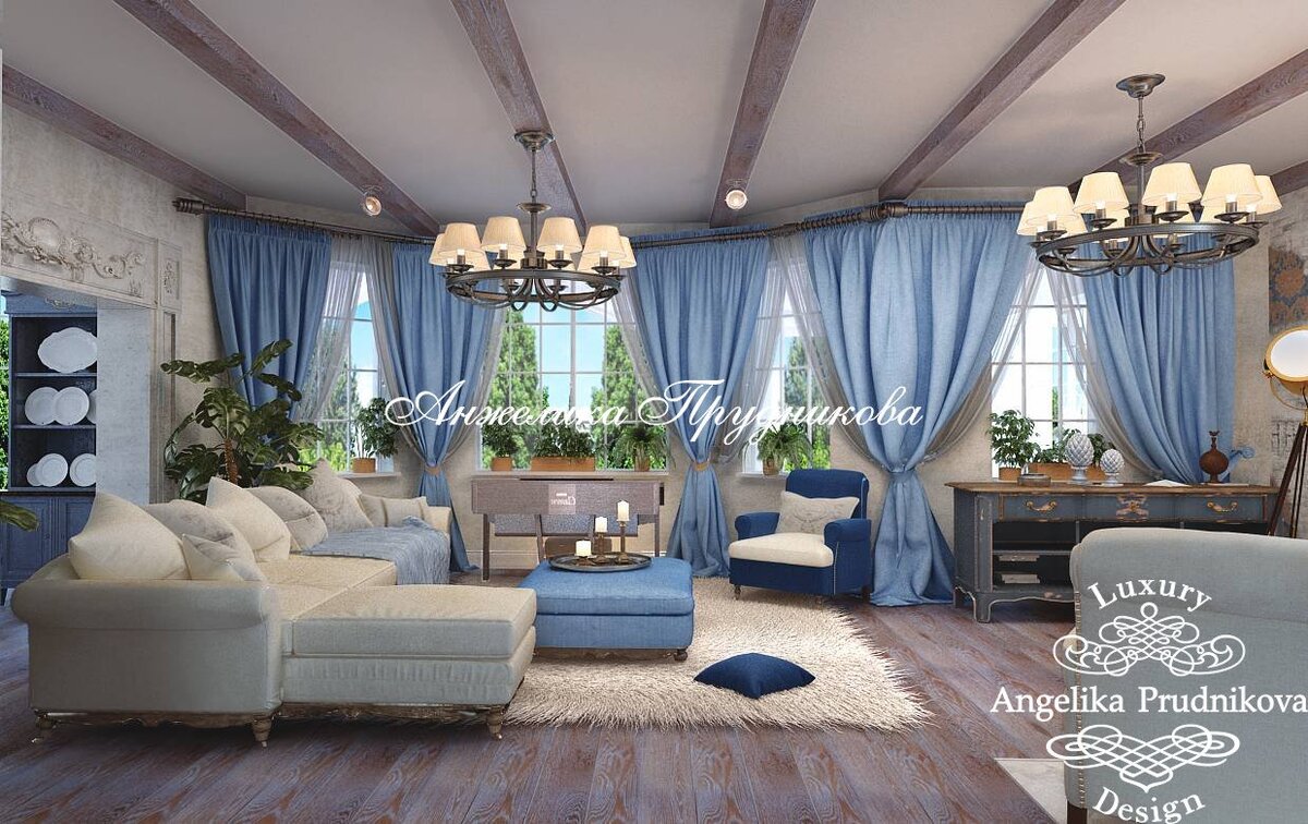 Дизайн дома Владимира Преснякова и Натальи Подольской реализован автором проекта дизайнером Анжеликой Прудниковой в уютном и очень модном сегодня стиле прованс. Благодаря фактурной штукатурке, состаренным балкам и полам из брашированной доски интерьер получился харизматичным и запоминающимся, а дизайнерские светильники и аксессуары из меди и латуни добавили в него винтажную нотку. «Сердцем» просторной гостиной, оформленной в природной цветовой гамме с добавлением характерных для прованса голубых оттенков, является камин из песчаника с купольным дымоходом. Он хорошо смотрится в окружении традиционной мягкой мебели в американском стиле и задает тон всему интерьеру. В кухне центральное место занимает островная барная стойка с эффектным подвесом и винным стеллажом. А любимым местом отдыха хозяев дома являются музыкальная гостиная в мансарде и открытая терраса с домоткаными дорожками и антикварными креслами-качалками. В этом дизайн-проекте нашей Студии элитных интерьеров много и