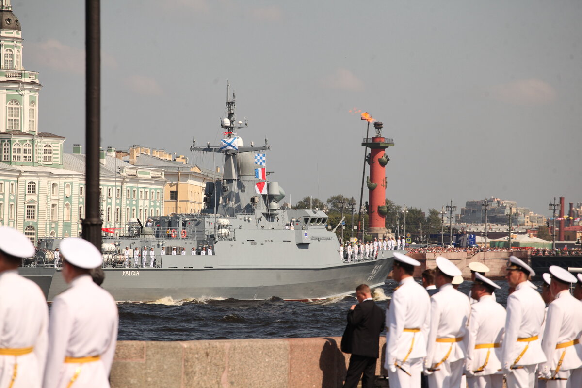 Ровно в 11:00 по отмашке красными сигнальными флажками артиллерийский расчет на Заячьем острове дал залп. Сразу после катер с президентом, министром обороны РФ Сергеем Шойгу и адмиралом Владимиром Королевым на борту под музыку отчалил от пристани и направился к парадному строю, стоящему на рейде. Большой десантный корабль «Минск» и его экипаж первым ответил на приветствие главнокомандующего троекратным «Ура!». Следом президентское судно направилось к противолодочному кораблю «Казанец», который пришвартовался возле стрелки Васильевского острова, а затем к 125-метровому фрегату нового поколения «Адмирал Макаров», оснащенному зенитной системой «Штиль». Далее президент проследовал мимо самого быстроходного из кораблей в акватории Невы - гвардейского корвета «Сообразительный». Завершила строй малошумная большая дизель-электрическая подлодка «Дмитров». Ее экипаж в белоснежной форме был виден со всех набережных и особенно выделялся на фоне черного корпуса. Для судна, способного погружаться до 250 метров, стоять на рейде на виду у всех - непривычное состояние.