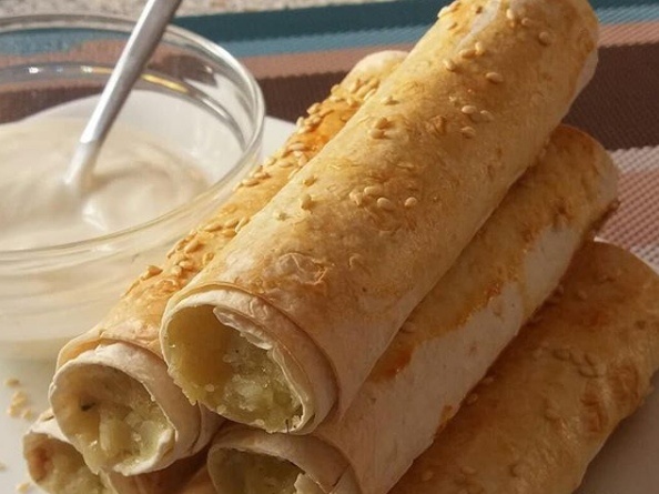 Ингредиенты: ☘лаваш 2 листа☘картофель 5 штук больших☘зелень☘2 зубка чеснока☘соль, перец☘сыр 30 грамм☘яйцо (оливковое масло)☘кунжут Приготовление: Картофель отварить и растолочь. Добавить чеснок, соль, перец и натертый сыр (мужу не добавляла- он постит).Из листа лаваша нарезать прямоугольники (у меня 6 штук), из двух листов - 12.На край прямоуголька положить картофельную смесь и свернуть в трубочку. Трубочки выложить на силиконовый коврик, смазать яйцом (тому, кто постит- оливковым маслом) и посыпать кунжутом. Сверху посыпать кунжутом. Запекать в духовке 20 минут при 200 градусах. Получаются хрустящие. Приятного аппетита!