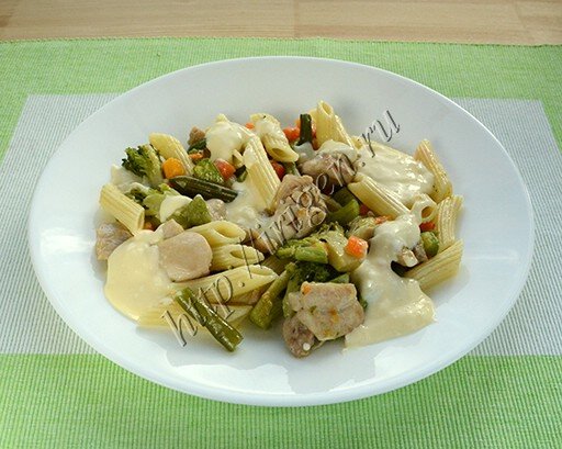 Вкусное, простое и диетическое блюдо из курицы, пасты (макаронных изделий) и овощей под сырным соусом. Пасту можно использовать любую – пенне, ригатоне, ротелли, тортильони, фарфалле, фетучини, фьори и т.д. Ингредиенты: (на 2-3 порции) Ингредиенты для сырного соуса: Отварить макаронные изделия в подсоленной воде и вынуть их из воды шумовкой. Воду оставить в кастрюле. Куриные окорочка или филе нарезать небольшими кусочками. На сковороду влить растительное масло, нагреть и выложить кусочки курицы. Посолить и слегка обжарить. Очистить морковь. Нарезать морковь и кабачок мелкими кубиками. Добавить в сковороду к курице. В воде, в которой варились макароны, отварить в течение 3-5 минут стручковую фасоль и брокколи. Вынуть овощи шумовкой и добавить в сковороду. Накрыть сковороду крышкой и нагревать на слабом огне 5 минут, затем добавить отваренные макаронные изделия и нагревать еще 5 минут. В это время приготовить сырный соус. Подготовить нужное количество молока, и натереть сыр на терке. С