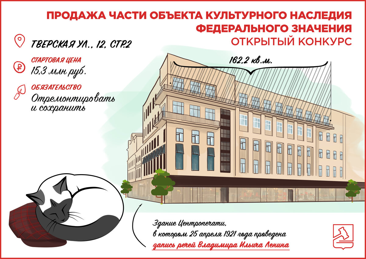 Часть здания Центропечати, где Владимир Ильич Ленин записывал свои обращения к народу, выставил на открытый конкурс Департамент города Москвы по конкурентной политике. Объект продажи включает в себя семь нежилых помещений общей площадью 162,2 квадратных метров, расположенных на пятом этаже исторически значимого дома – здание Центропечати, в котором 25 апреля 1921 года проведена запись речей Ленина «О продовольственном налоге», «О концессиях и о развитии капитализма», «О потребительской и промысловой кооперации» по адресу: Тверская,12, стр.2. Открытый конкурс предусматривает подачу предложений о цене участниками в запечатанных конвертах, сообщил руководитель Департамента города Москвы по конкурентной политике Геннадий Дёгтев. «Власти Москвы выставили на конкурс помещения, расположенные в здании, являющимся объектом культурного наследия федерального значения. Победитель торгов должен выполнить обязательные условия сделки – провести реставрационные работы и приспособить помещения под сов