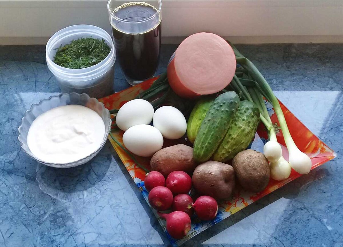 Ингредиенты: Картофель 5 шт. Яйцо куриное 4 шт. Вареная колбаса 300 г. Редис 5-7 шт. Огурец 2-3 шт. Хлебный квас. Зеленый лук, укроп, сметана. Соль по вкусу. РЕЦЕПТ Картофель отварить в мундире. Яйцо сварить вкрутую. Все ингредиенты порезать кубиками. Залить квасом. Зелень, сметана, соль по вкусу. Приятного аппетита.