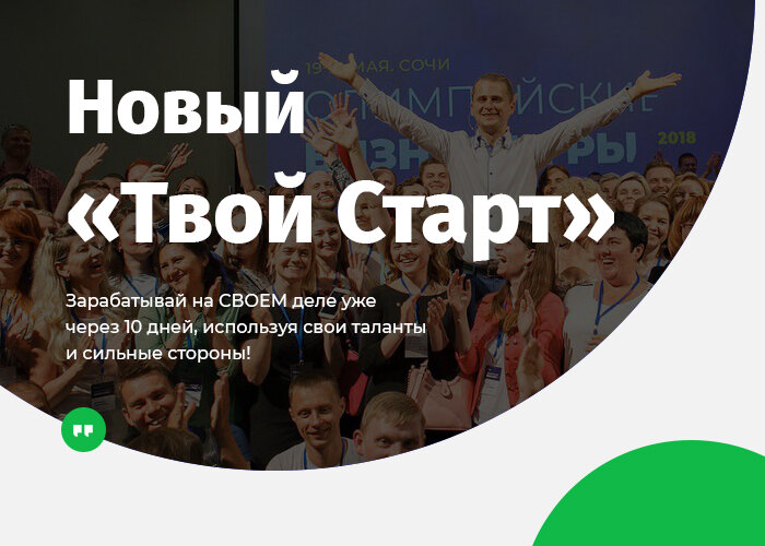 Сейчас изо всех углов звучат обещания о миллионных заработках уже через пару дней.. Никогда не поддавайтесь на такие обещания, это невозможно. А что реально возможно чуть больше, чем за неделю? Найти любимое дело, сделать первый шаг и получить деньги с первых сделок. По признанию моих друзей-миллионеров, это ключевой момент, который делит жизнь на до и после. Мой знакомый предприниматель-практик, Евгений Ходченков, создал такую систему, в которой все это может сделать любой, вне зависимости от достатка и места проживания. "Твой Старт" — это бесплатная бизнес-игра, в которой за 10 дней вы научитесь зарабатывать, используя свои таланты и сильные стороны.