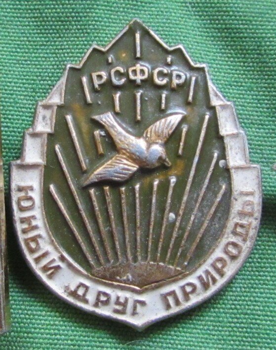 Имеется у меня и не в одном количестве значок "Юный друг природы". Мне кажется, почти в каждой семье он есть (много где видел). Если кто не помнит, то значок выглядит вот таким образом: В 1918 году впервые появилось движение юных любителей природы. А спустя 60 лет Общество любителей и защитников природы утвердило свою атрибутику. В частности, был утвержден специальный значок. На значке на фоне солнечных лучей изображена птица (уж не голубь ли?), вверху надпись РСФСР, по краю название общества "юный друг природы". Стать членом общества мог любой школьник в возрасте до 16 лет. При вступлении выдавался нагрудной значок и соответствующее удостоверение. На коллекционном рынке можно часто увидеть эти значки в продаже. Средняя цена - всего 30-40 рублей. Но даже при такой небольшой стоимости подобные значки мало кто покупает. Объясняется это просто - предложение намного превышает спрос.