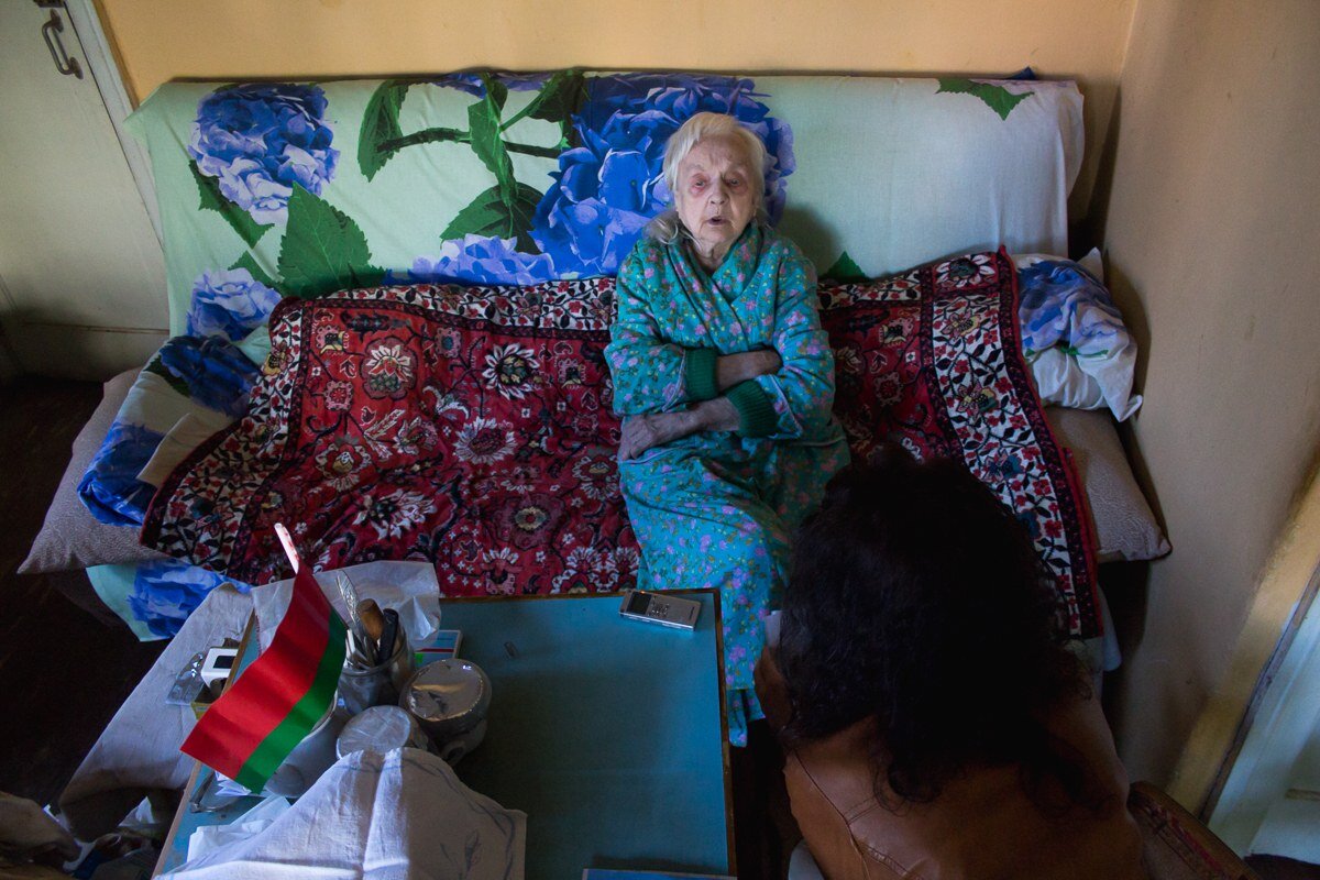 С этой светлой, но уже слабой и почти прозрачной бабушкой мы разговариваем в ее маленькой однокомнатной «хрущевке», которая находится в центре Минска, на улице Богдановича. В квартире все пропитано запахом корвалола и старости, здесь как будто остановилось время. Кажется, что последней здесь побывала тень самого Хрущева. Старый обшарпанный пол, скрипучая кровать, глубоко въевшиеся в стены трещины, дисковый телефон, который не работает больше 15 лет. «И сама я вон какая старая», — кряхтит, пытаясь подшутить над обстановкой, Клавдия Никандровна. Проходя мимо зеркала, она старается в него не смотреть.