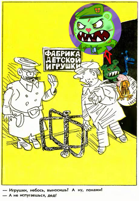 «...Happy Tree Friends… там есть такой Прапор Флиппи — бывший вояка с наглухо отбитыми мозгами. Он, вообще-то, очаровашка и хочет просто жить и радоваться жизни, но ему то и дело что-то напоминает войну. То сучья в костре затрещат, как выстрелы, то кто-нибудь кетчупом угваздается так, что похоже на кровь… Ну и всё, у Флиппи включается боевой режим, и он начинает крушить всех вокруг». «Золото колдуна» Рассекреченные советские архивы помогли пролить свет на тёмное прошлое одного из самых харизматичных персонажей Happy Tree Friends – Прапора Флиппи. Выяснилось, что чудовищная жестокость, в которую впадает этот миляга под влиянием посттравматического стрессового расстройства, обусловлена его пребыванием в красном концлагере. На этом изображении запечатлён момент дерзкого побега Флиппи с так называемой «фабрики детской игрушки». Чудовищная коррупция, пронизывающая карательный аппарат Советов, помогла нашему герою спастись. Но в его памяти навсегда отпечатался кошмар тех дней: – Это б
