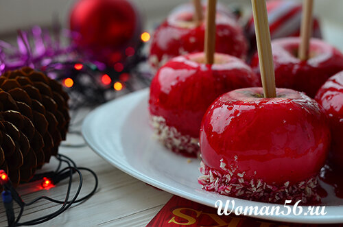 Яблоки в карамели – популярный десерт, который готовят во многих странах. Это лакомство довольно популярно в праздничные дни. Вы легко можете приготовить яблоки в карамели в домашних условиях, рецепт их очень прост. Ингредиенты рецепта: Приготовление яблок в карамели в домашних условиях – рецепт с фото Для приготовления выбирают кисло-сладкие, сочные яблоки среднего размера – ингредиенты рассчитаны на 8-10 шт. Яблоки необходимо хорошо вымыть, магазинные фрукты часто для транспортировки покрывают восковым составом или чем-то подобном. Если это вещество останется на кожуре, карамель будет скатываться и застынет неравномерно. Далее протирают яблоки полотенцем, удаляя всю влагу. Важно чтобы не оставалось ни одной капли воды – от этого также зависит структура карамельной глазури. Удаляют все хвостики и листву. Палочки могут быть для барбекю или для мороженого. Они должны быть деревянными и крепкими, чтобы выдержать вес яблока. Палочку вдавливаем в яблоко на месте роста хвостика,