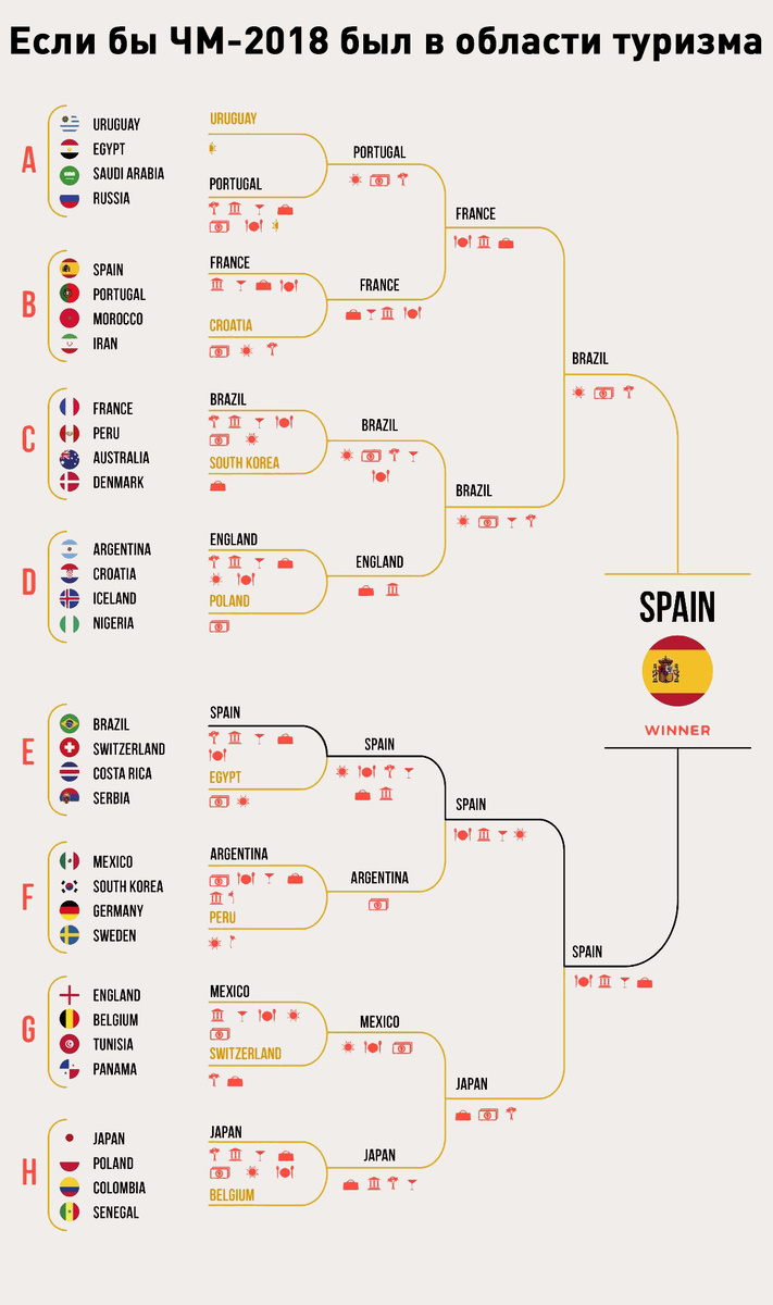 Давайте представим, что 32 страны, которые приехали в Россию, соревновались бы не в футболе, а в туристической привлекательности. Об этом пишет Maps&Data. В таком турнире ценятся не голы, а прекрасные пляжи, теплая погода, богатая культура, разнообразная кухня, интересная ночная жизнь, шоппинг и уровень цен на это всё. К сожалению, в таком турнире 🇷🇺 Россия не вышла бы из группы. Она вничью сыграла бы с 🇸🇦 Саудовской Аравией (3:3), проиграла бы 🇪🇬 Египту (3:4) и 🇺🇾 Уругваю (3:4). Из группы А вышли бы Уругвай и Египет. P.S. Германия тоже бы не вышла из группы. В финале ЧМ по туризму встретились бы 🇪🇸 Испания и 🇧🇷 Бразилия, где со счетом 4:3 выиграла Испания. 🇫🇷 Франция и 🇯🇵 Япония поделили бы третье и четвертое места. Подробный разбор здесь. Понравился материал? Поставьте, пожалуйста, «пальц вверх» 👍 и также вы можете подписаться на наш канал здесь.