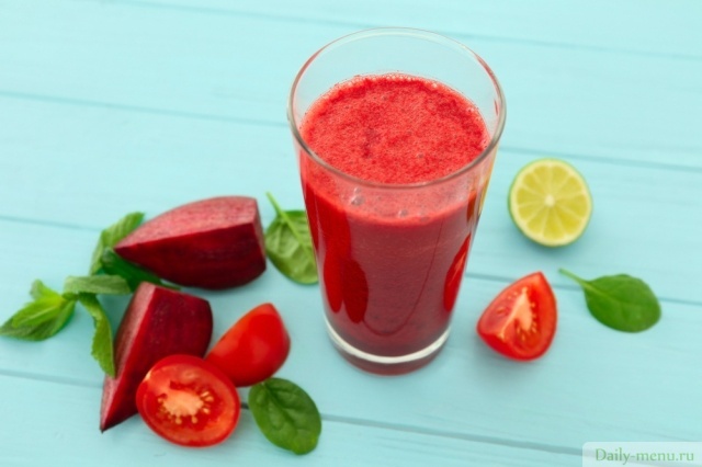Такое сочетание вы точно не пробовали! Свежий оригинальный вкус и море витаминов. Рекомендуем! На 2 стакана потребуется: 😊 1-2 свёклы, 😊 300 г помидоров, 😊 немного лайма, 😊 соль Приготовление: 1. Свёклу очистить, помидоры вымыть и всё пропустить через соковыжималку. 2. Разлить сок в бокалы, в каждый выжать немного лаймового сока и по вкусу добавить соль. Интересный коктейль получается, если использовать не свёклу, а свекольную ботву. Пробуйте, экспериментируйте! Калорийность и БЖУ: На 1 порцию/250 г: 92 ккал, Белки: 2 г, жиры: 0.3 г, углеводы: 20.7 г