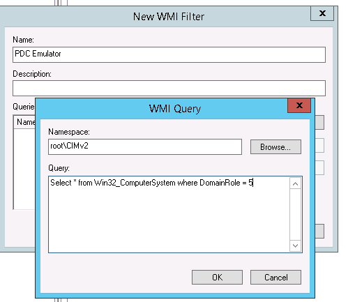 Этот шаг предполагает настройку контроллера домена с ролью эмулятора PDC на синхронизацию времени с внешним NTP сервером. Т.к. теоретически роль эмулятора PDC может перемещаться между контроллерами домена, нам нужно сделать политику, которая применялась бы только к текущему владельцу роли PDC. Для этого в консоли управления Group Policy Management Console (GPMC.msc), создадим новый WMI фильтр групповых политик. Для этого в разделе WMI Filters создадим фильтр и именем PDC Emulator и WMI запросом: Select * from Win32_ComputerSystem where DomainRole = 5