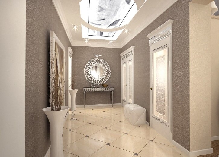 При выборе оформления прихожей необходимо отталкиваться от площади и конфигурации данного помещения. Для обустройства небольшой прихожей лучше всего подойдут встроенные шкафы. Также арки вместо традиционных дверей визуально расширяют пространство. В прихожей не рекомендуется размещать массивную мебель. Наличие лишних вещей в этом помещении создаст ощущение захламленности. Поэтому для их хранения лучше приспособить лоджию или кладовку. Если хозяева отдают предпочтения аркам, то можно выделить зону прихожей при помощи полосок на полу или потолке. Высокие потолки не всегда являются преимуществом. Если они расположены в небольшом помещении, то оно визуально кажется еще более тесным. Чтобы расширить пространство, необходимо наклеить на потолок темные однотонные обои, например, шоколадные. Кроме того, устранить эффект «тесноты» помогут антресоли. Необходимо учитывать, что определенные отделочные материалы «крадут» пространство. Так, панели на стене забирают несколько драгоценных сантиметров