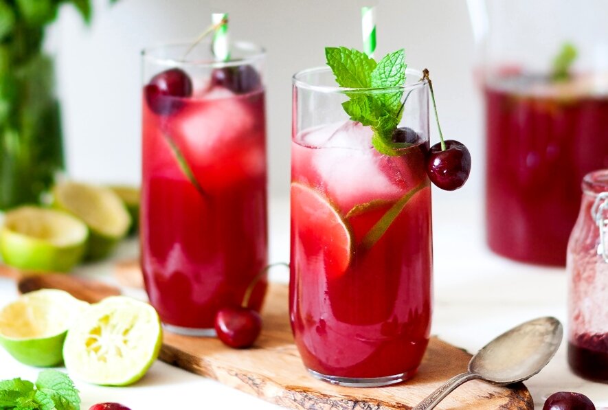 Такой лимонад в домашних условиях можно приготовить элементарно. Сначала мы берем 2 стакана вишни. Можно даже 3, если собирается большая компания. Также выжимаем несколько лимонов так, чтобы получился стакан сока. Следующий шаг – варим сироп. Для этого нам понадобится стакан воды и половина стакана сахара. Варим на небольшом огне примерно минут 10. Наша цель – чтобы сахар полностью растворился. Последний нужный нам ингредиент – 6 стаканов льда. Можно тоже взять побольше пропорционально количеству вишни. Всё хорошенько смешиваем в блендере, пока не получится однородная масса. Разливаем по стаканам. Для украшения подойдут листочки мяты – по контрасту будут смотреться очень эффектно. Подавать нужно незамедлительно. Очень вкусно!