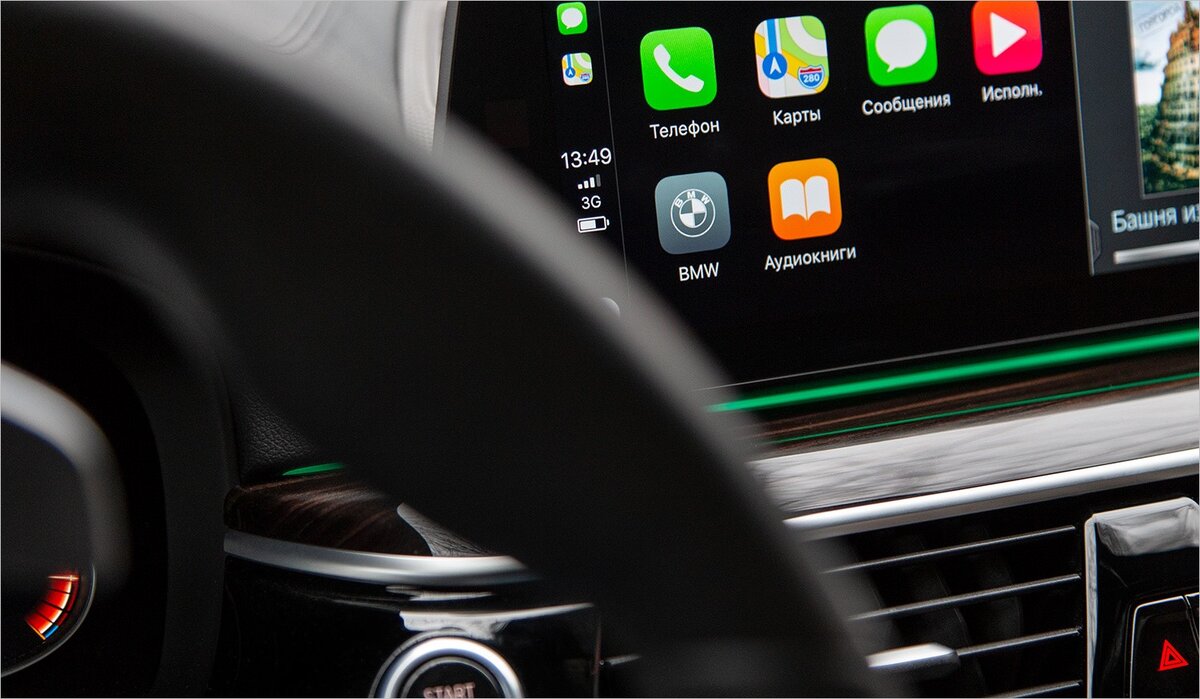 Управлять приложениями можно как с мобильного телефона, так и с помощью шайбы iDrive, так как все приложения адаптированы для автомобилей (A4A, Apps for Automotive). Есть и поддержка Siri, вызов которой (после подключения по Bluetooth) можно забиндить на кнопку активации звуковых команд на руле (короткое нажатие кнопки — голосовой ассистент BMW, длительное — Siri). Также есть информация о поддержке Amazon Echo и Alexa, но вживую потрогать не довелось.