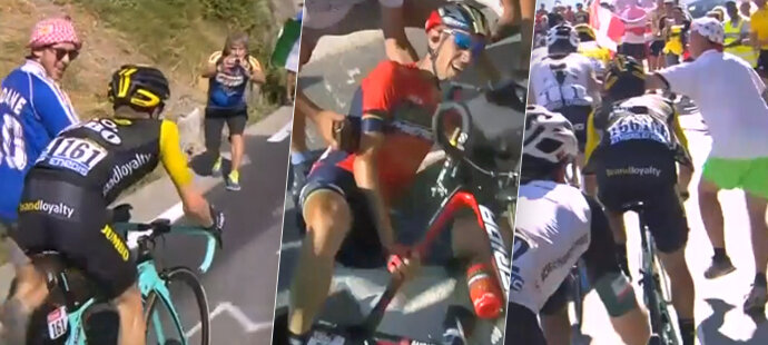 Это регулярн каждого года Тур де Франс. Недобросовестные зрители, которые выскакивают на дорогу, пытаются прикоснуться к спорсмену или сделать себя самоубийцами. Психологическая поддержка велосипедистов? Очень опасная забава. Не только для них, но особенно для велосипедистов. Организаторы сражаются с ними, и каждый год условия ужесточаются, но их много на трассе. И в чрезвычайно сложной 12-й стадии гонки они действительно появились, из-за них один из фаворитов Винченцо Нибали оказался в больнице, для него Тур был полностью окончен, драматические моменты были также испытаны другими