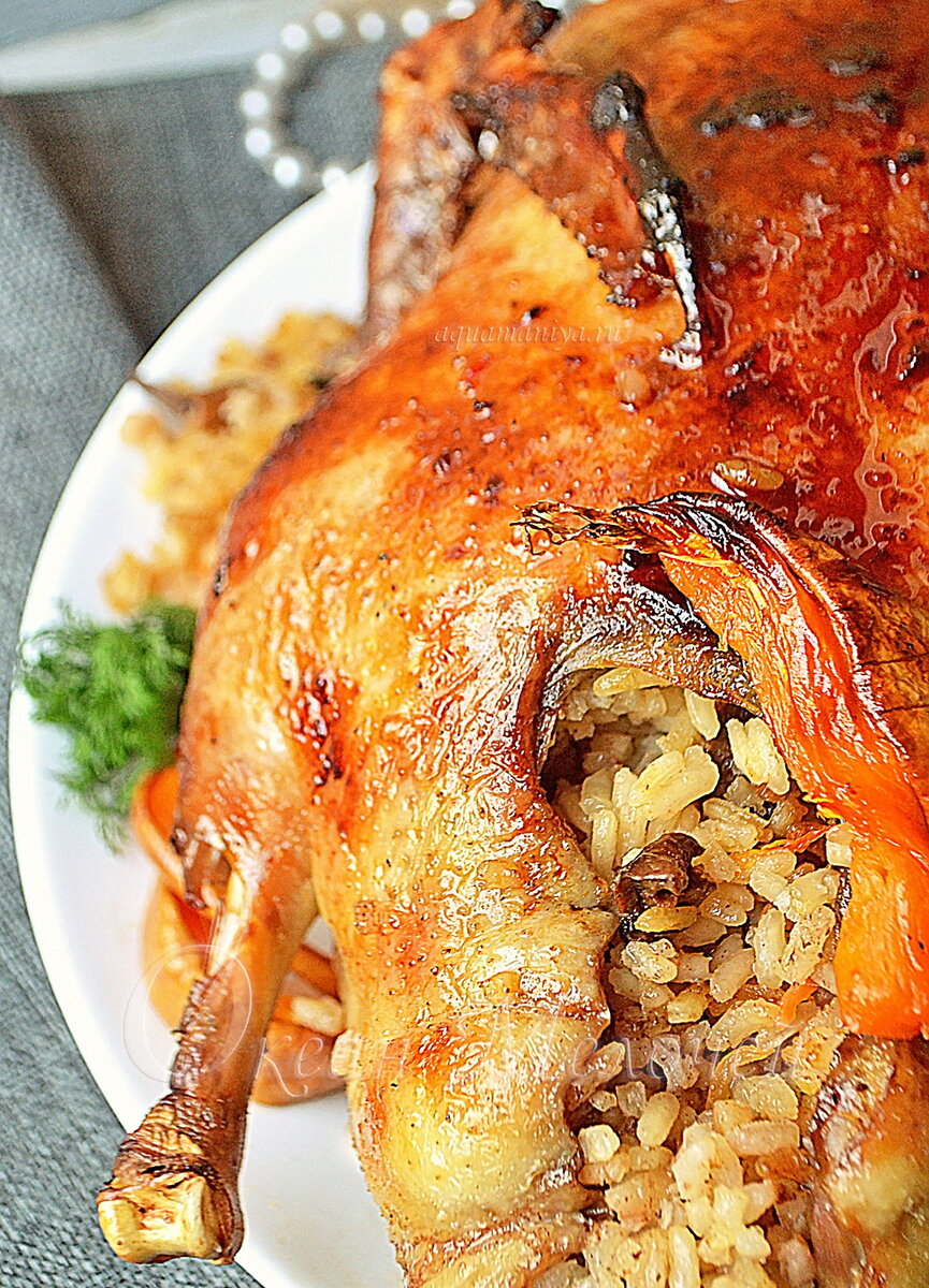 помидоры и огурцы для украшения. Гуся отвариваем в большой свободной кастрюле и оставляем ненадолго охладиться. Тем временем мелко режем лук, морковь натираем на терке и обжариваем их сливочным масле. Рис варим, солим и смешиваем с морковью и луком. Большой ложкой фаршируем нашего гуся. Нашу птицу натираем солью, перцем и майонезом. Заворачиваем в фольгу, кладем на противень и в духовку. Доводим до готовности. Перед подачей на стол украшаем овощами и зеленью. Приятного аппетита!