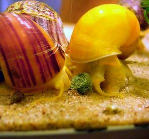 Типы Asolene, Lanistes и Marisa делают это в воде.