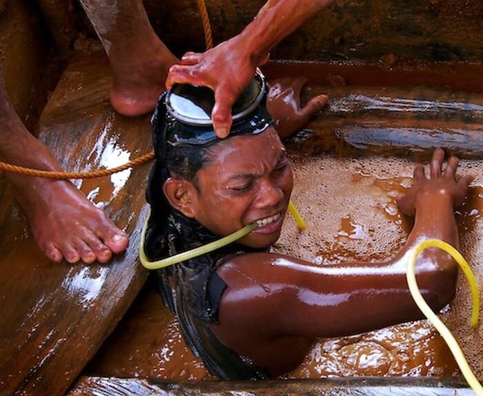 Иногда мне страшно. Вдруг я упаду или меня завалит камнями Когда я спускаюсь вниз, я молюсь о том, чтобы нас не завалило Шахтёры понимают, что, когда они в воде, то одной ногой в могиле Мы никогда не задумываемся, когда носим на себе золотые украшения, подаренные нам людьми, которые нас любят или просто перешло по наследству. Возможно, ради кольца, которое подарила Ваша жена или муж, погиб очередной шахтёр-филиппинец. Они делают это не ради больших денег и богатого будущего своей семьи. Им просто не на что жить. Делая очередную ходку, погружаясь в бездну и, надеясь найти в пустоте хоть немного спасительной крупы Даже дети принимают активное участие Прислушиваться приходится к любому шороху - А вдруг обвал? Дети играют немаловажную роль в процессе добычи Столько людей задействовано и всё ради маленького кусочка счастья