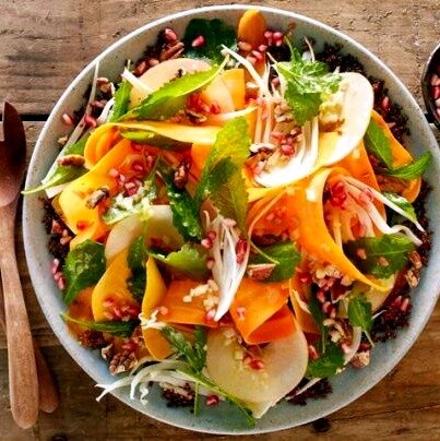 - На листья салата уложите морковь, тыкву, яблоко и лук. Посыпьте орехами и зернышками граната.