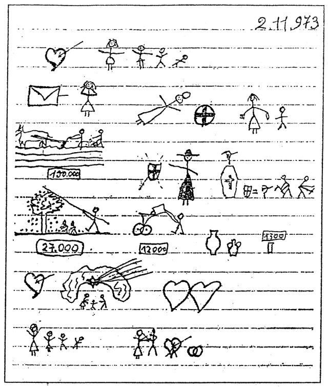 "Несколько лет назад - не так уже и давно, - между супругами из Сицилии завязалась редкая по своей форме переписка. Он эмигрировал на работу в Германию, она осталась в стране, чтобы заботиться о старой свекрови и своём молодом потомстве. Неграмотные и не желающие посвящать писца на рынке в тайны их личной жизни (они содержат излияния любви и новостей бытового характера), пара прибегает к системе последовательных пиктограмм, смысл которых вполне понятен получателю.