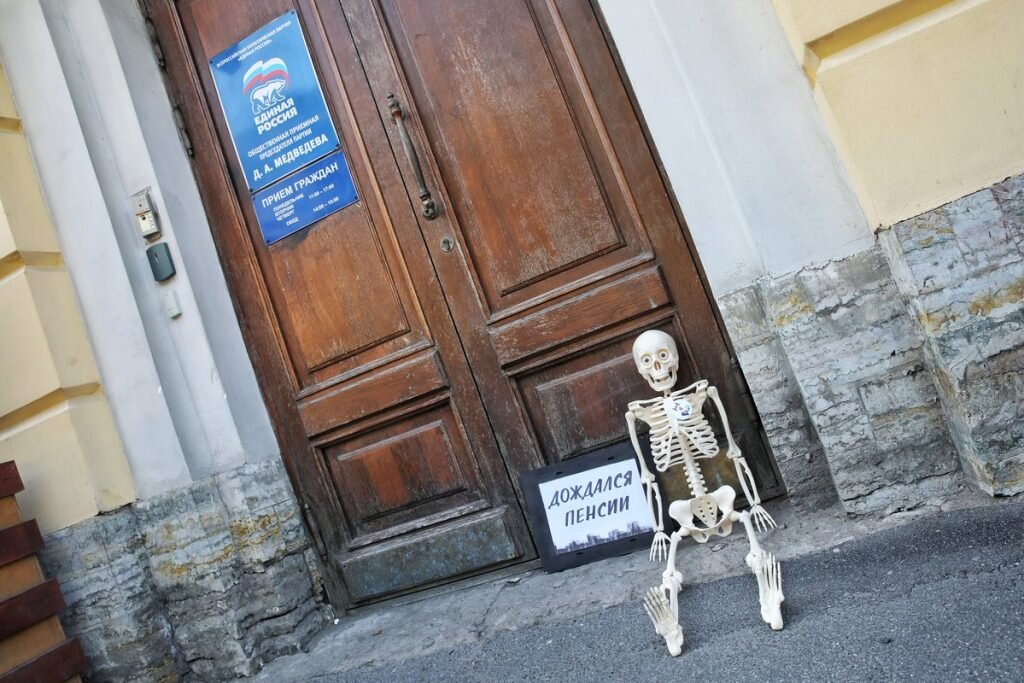 В Питере у офиса «Единой России» положили скелет с надписью «Дождался пенсии»