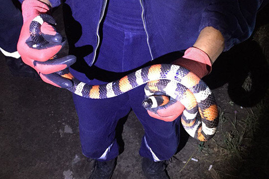 На улице Волгоградской в Казани поймана экзотическая полосатая змея длиной около метра. О змее, которая ползала в посадке рядом с гуляющими детьми, сообщили по номеру 112 очевидцы. Инцидент с необычной змеей произошел на Волгоградской, 41 поздним вечером 19 июля. Как сообщают в главном управлении МЧС России по РТ, выехавшие на место спасатели поймали не одну, а сразу двух змей — вторым оказался обыкновенный уж, которого отпустили в природную среду. Испугавшую казанцев полосатую змею передадут в зооботсад, сказали в МЧС. Вид змеи неизвестен. Судя по фотографии, это один из подвидов королевской змеи — рода неядовитых змей семейства ужеобразных. Королевские змеи имеют яркую окраску, не агрессивны к человеку и легко приручаются, их часто содержат в террариумах.