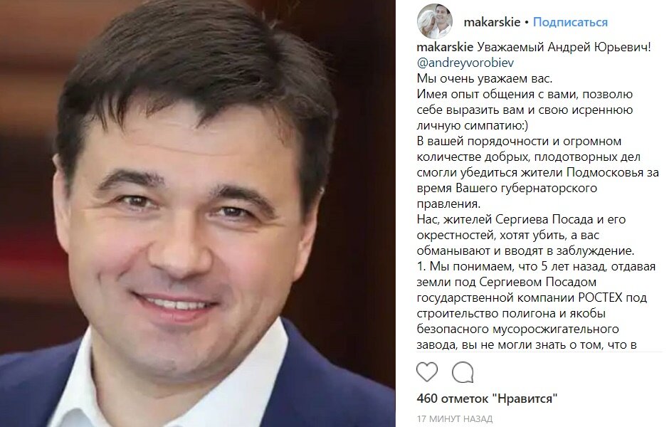 В Инстаграме известной в России семьи актёров Антона и Виктории Макарских появилось обращение к губернатору Московской области Андрею Воробьеву. В нём они заявили, что их, как жителей Сергиева Посада и его окрестностей, хотят убить, разместив на территории Сергиево-Посадского района (в 18 км от города) царь-полигона для 12 районов Подмосковья и Москвы (на 1 млн тонн мусора в год с перспективой роста до 1 млн 750 тысяч тонн). Согласно официальным документам застройщика, мусор Сергиево-Посадского района будет занимать лишь 7% от всего объема. Уважаемый Андрей Юрьевич! @andreyvorobiev Мы очень уважаем вас. Имея опыт общения с вами, позволю себе выразить вам и свою исреннюю личную симпатию:)В вашей порядочности и огромном количестве добрых, плодотворных дел смогли убедиться жители Подмосковья за время Вашего губернаторского правления. Нас, жителей Сергиева Посада и его окрестностей, хотят убить, а вас обманывают и вводят в заблуждение. 1. Мы понимаем, что 5 лет назад, отдавая земли под