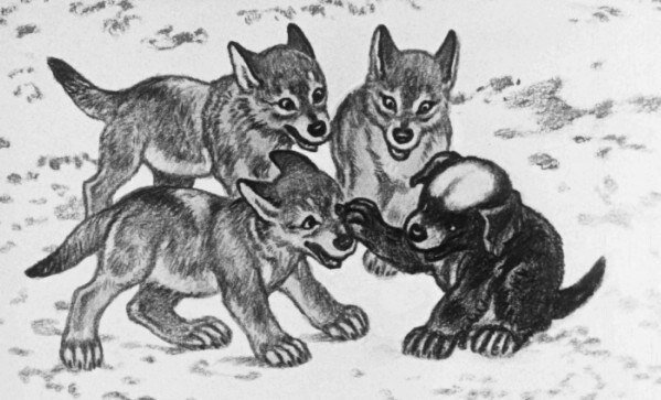 Кланы волков живут во вражде с кланами людей. Люди отнимают у волков территорию и стреляют их для развлечения. Голодные волки воруют у людей мелкий скот. В чеховском рассказе «Белолобый» мы видим обычного дворового щенка, который ещё не понимает межвидовой вражды. Сам того не ведая, белолобый сначала спасает ягненка. Это происходит тогда, когда волчица-мать в суете по ошибке вместо ягнёнка хватает щенка. В другом случае белолобый спасает волчицу. Он принимает на себя вину за сломанную крышу и наказывается хозяином за это. Глупый, казалось бы, щенок радуется всем и каждому. Он радуется человеку, которому призван служить. Он радуется овцам, они для него — тепло и уют. Он радуется волчице и ее детям. Оказавшись в буквальном смысле во вражьем логове, Белолобый приглашает волчат играть. Они играючи небольно кусают его. Даже тогда, когда волчица собирается съесть его, щенок