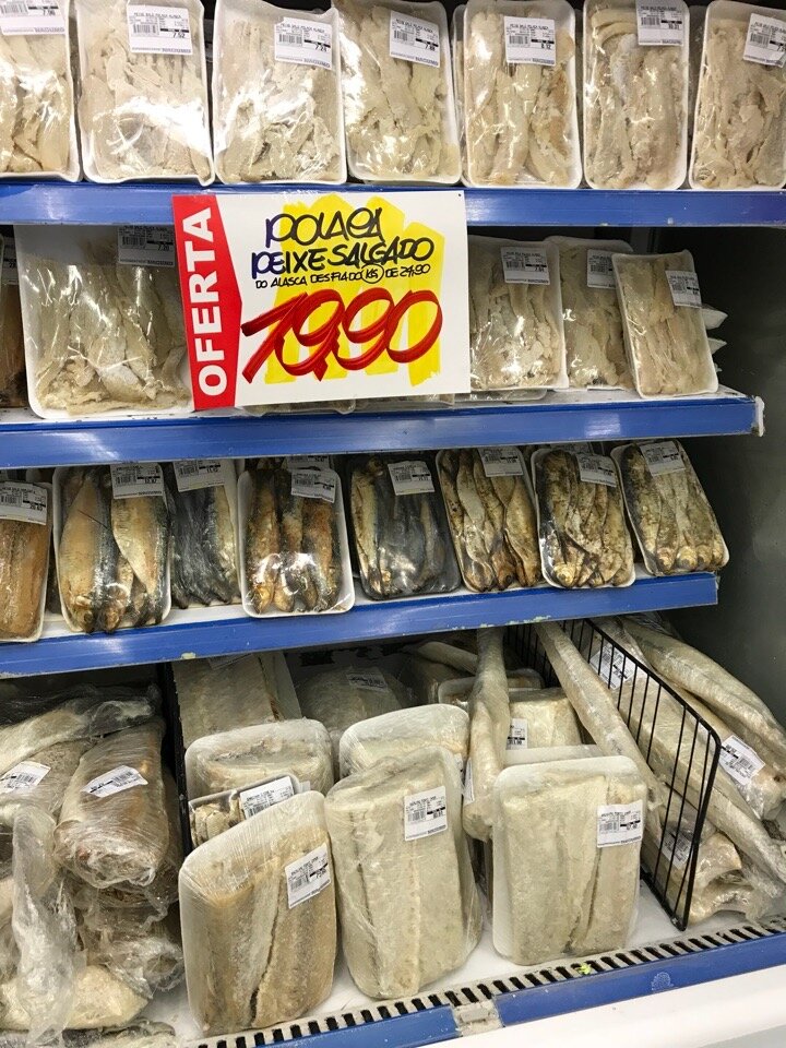 В предыдущих постах я рассказывала о том, чем отличается в Бразилии молочка,макароны и чай, а также о мясе, фруктах и сладостях. Ссылки оставляю внизу, если кто хочет ознакомиться. А сегодня расскажу о морепродуктах и рыбе, сухих завтраках и алкоголе. 1. Рыба и морепродукты. Не смотря на то, что Бразилия имеет обширный выход к океану, с морепродуктами здесь не все так просто. В Сан-Паулу, конечно, найти свежую рыбу можно, но для этого придется отправиться на рынок. В магазины же привозят рыбу мороженную и упакованную. Креветки и прочие морепродукты тоже можно найти в заморозке, но цены вас неприятно удивят. Есть штаты, где морепродукты можно на каждом углу найти, например в Сальвадоре-де-Баия, но мы живем в пригороде Сан-Паулу, и в нашем магазине свежей рыбы нет вообще. Купить здесь можно только соленую рыбу (треску, сардины и пр.). Выглядит это крайне неаппетитно. И воняет к тому же. Что бразильцы с этим добром делают? Я знаю один единственный рецепт с соленой треской, который имеет