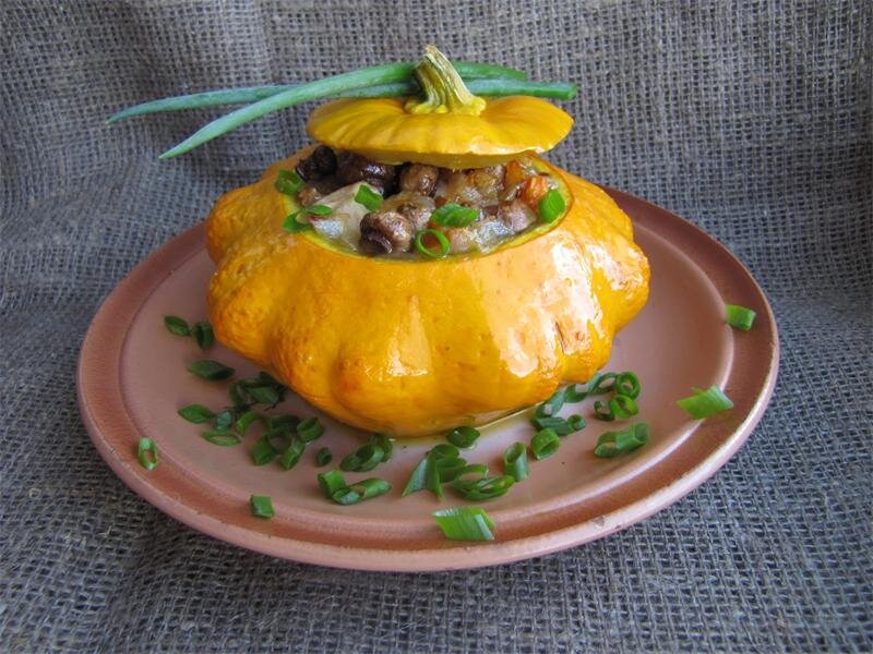 3 Лучших блюда из паттисона. Французское слово patisson, он же тарельчатая тыква, образовано от слова pate - пирог. И вот, готовя патиссон, поем с Матье мы в унисон. Возни тут немного, но за шикарный обед, вам скажут спасибо и сын, и сосед. Если вы вегетарианец - этот рецепт точно для вас. Берем патиссоны, моем, срезаем верхушку, чистим серединку, домик готов. Лук и натертую на терке морковь обжариваем, помидоры режем кусочками, добавляем баночку зеленого горошка, также можно добавить отдельно обжаренные грибочки. Тушим всё вместе, в конце добавляем соль, перец по вкусу, немного сметаны. Набиваем получившимся фаршем наши домики, накрываем крышечками, каждый в фольгу и в духовку на 40 мин. Если вы мясоед — это блюдо тоже вам вполне подойдет. В поджаренную до полуготовности луково-морковную смесь добавим мясной фарш, помидоры, солим-перчим по вкусу, тушим до готовности фарша. Начиняем этой смесью подготовленные патиссоны, так же накрываем крышечками, заворачиваем каждый в фольгу - и д