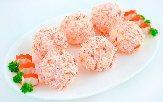 100 гр. арахиса. Сыр натираем на терке, добавляем мелко натертые яйца и чеснок. Заправляем майонезом. Крабовые палочки натираем на терке. Сырную массу скатываем в шарик и внутри каждого прячем орешик. Обваливаем наш шарик в крабовых стружках и даем померзнуть в холодильнике. Подавать как холодную закуску. Приятного аппетита!