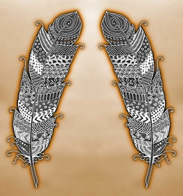 Всевозможные перья - популярный мотив в зентангле и дудлинге. Почему люди так любят рисовать перышки? Возможно, причина в их легкости, воздушности и красоте. Существует масса вариантов изображения перьев. Какой из них выбрать - решать вам. Перья птиц В природе у птиц перья отличаются по форме и окрасу. Но существует сходство в строении, то есть в основных частях перьев. Все знают яркие перья павлинов, однако у большинства птичек перышки невзрачные, у них превалируют серые, серо-белые, черные тона. Это необходимо для маскировки. В продаже можно увидеть яркие перья, специально раскрашенные для того, чтобы их можно было использовать в декоративных целях. Благодаря нашему воображению есть возможность придумать свою раскраску и узор на перышках. При этом важно придерживаться слегка продолговатой формы и плавности линий. Вот инструкция того, как можно нарисовать перо: Думаю, здесь понятно все без перевода. Вначале вы рисуете стержень. Затем вокруг него опахало. Это самая сложная часть