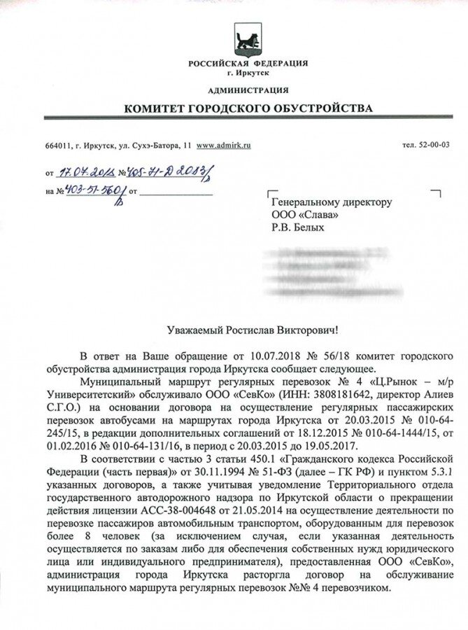 Иркутские чиновники попросту не допустили данного перевозчика к участию в конкурсах сразу по двум маршрутам регулярных пассажирских перевозок в городе: № 19 «микрорайон Берёзовый – Реабилитационный центр (улица М.Конева)» и № 4 «Ц. Рынок-м/р Университетский». Причина, в якобы имеющемся у ООО «Славы» ДТП по вине водителя с пострадавшими. Но, по информации перевозчика, эти данные не соответствует действительности. Тем не менее, они послужили поводом для Команды мэра Бердникова не допустить перевозчика к конкурсу на маршруты.